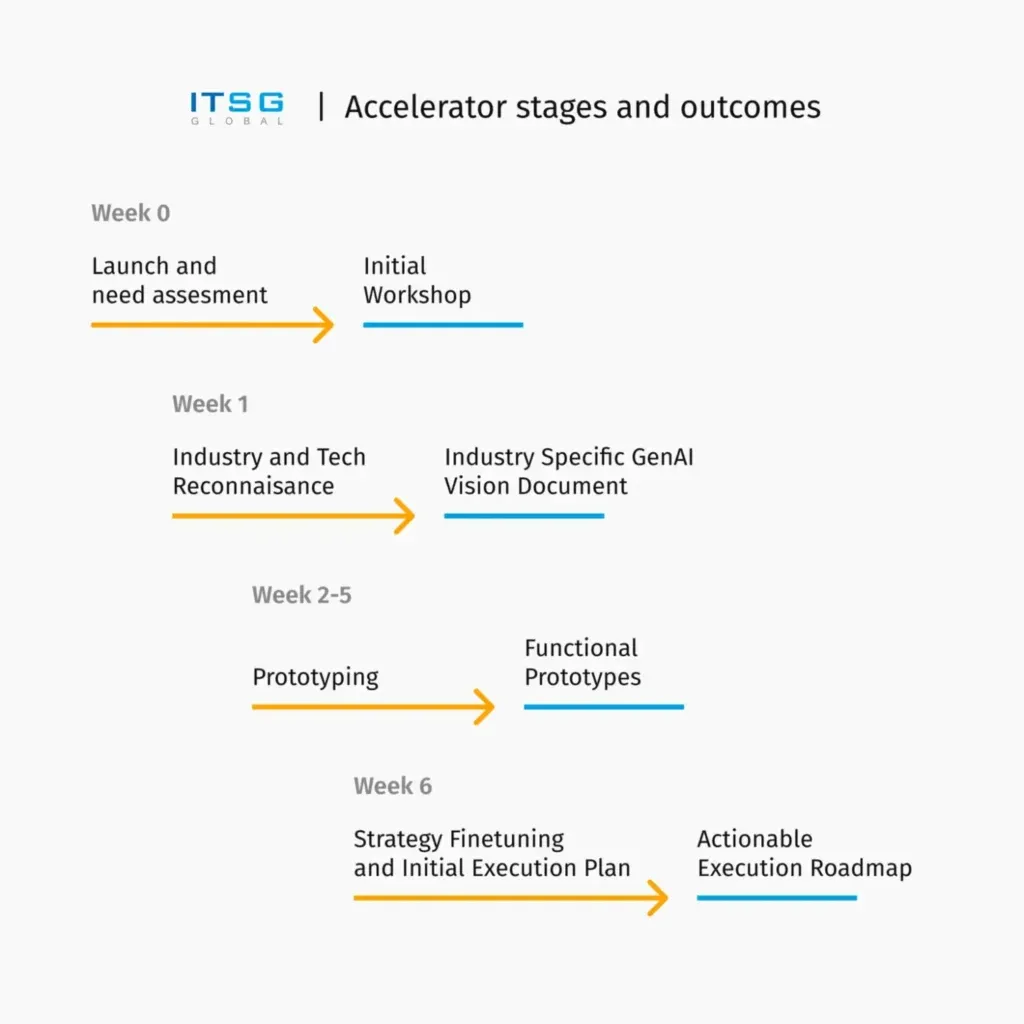 Creating a proof of concept (POC) lets organizations experiment with AI applications adjusted to their specific needs [6]. This smart, low-risk approach focuses on company-specific problems and datasets, helping businesses avoid costly investments in ill-fitting solutions. The prototyping process can take as little as a couple of weeks, providing visible results with minimal expenses. Programs like ITSG’s very own Generative AI Accelerator can guide you through this process, bridging the gap between AI potential and practical business value [16].