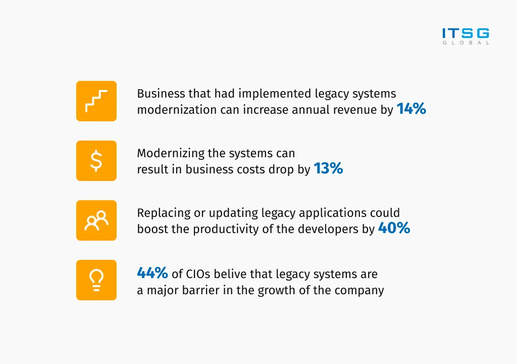 A crucial aspect of any business is security. Legacy systems happen to be susceptible to security vulnerabilities, data breaches, and system failures due to outdated technology and lack of regular updates (or even a possibility to do them). Modernizing these systems with the latest security protocols, encryption techniques, and compliance standards can help mitigate risks and ensure data security and regulatory compliance.