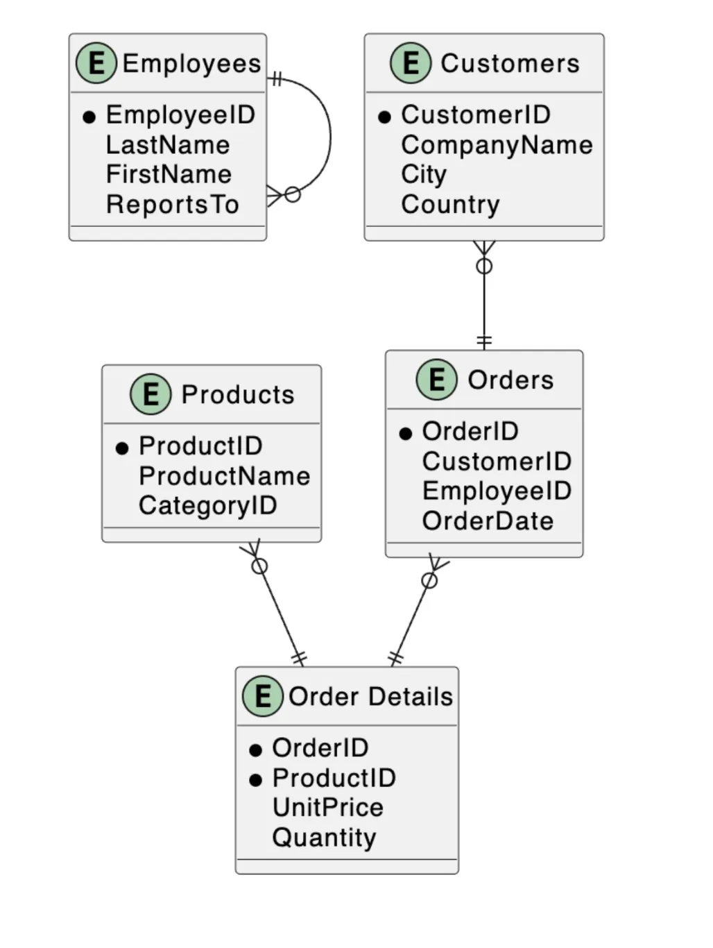 The domain is a sales and inventory management system, with business objects like employees, orders, products, customers, and suppliers suggesting a comprehensive enterprise resource planning (ERP) system or a customer relationship management (CRM) system.