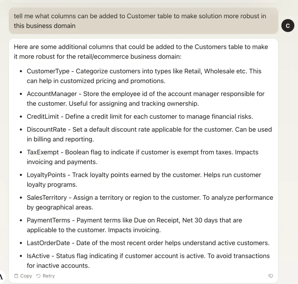 And then we can use Claude once more to give some brainstorming on which columns are missing. Quite naive but a great start for future brainstorming with the team.