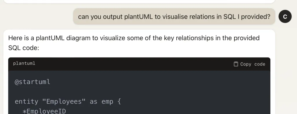 Furthermore, you can leverage GenAI to generate diagrams from SQL queries using language like PlantUML.